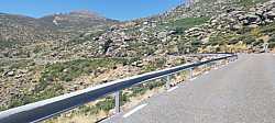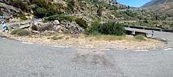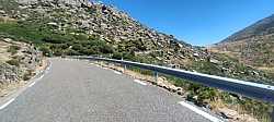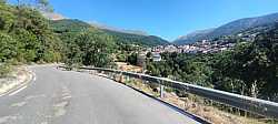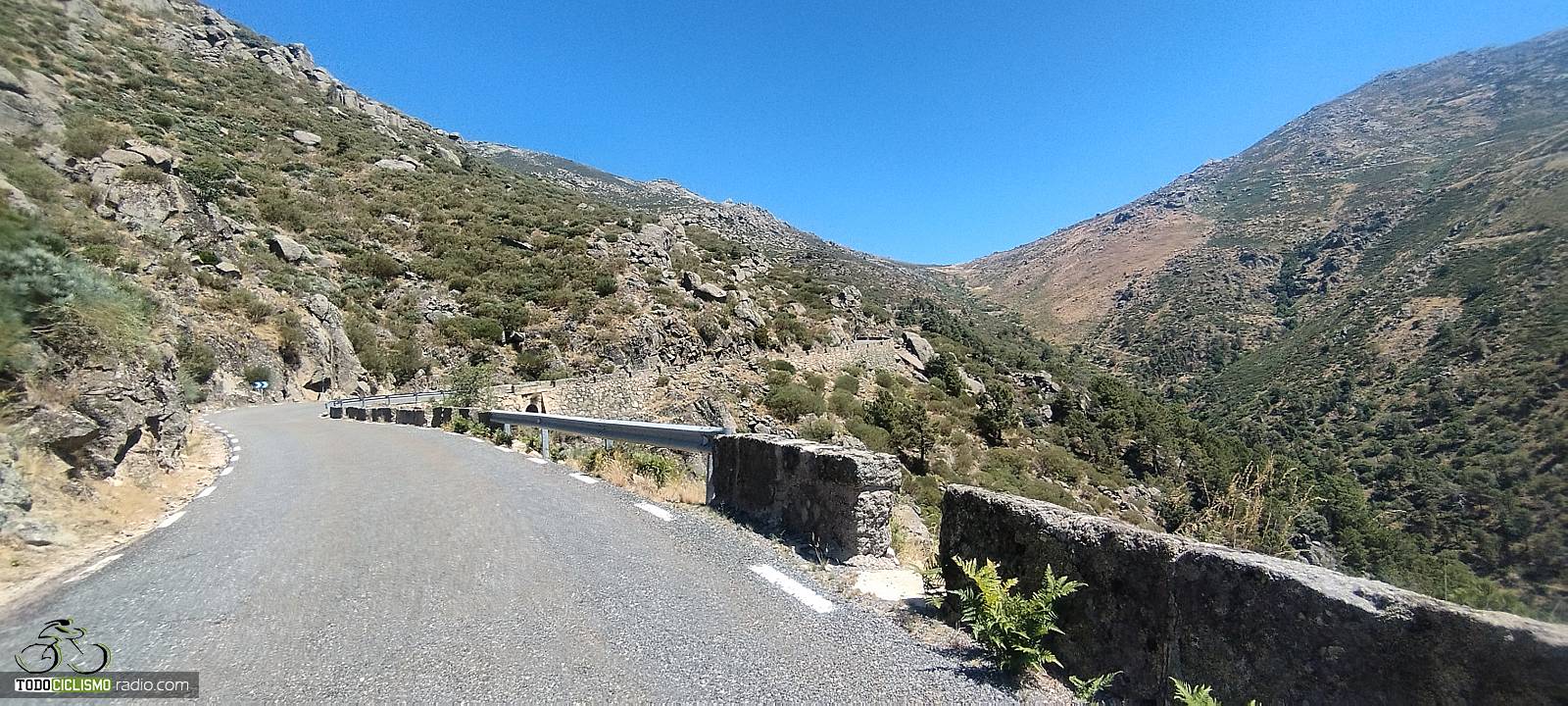 Entramos entonces en la parte más salvaje del puerto, con menos presencia de pueblos y más sensación de alta montaña. Vemos a un lado el río encajado abajo y, al otro, las laderas de Gredos levantándose sobre nosotros. A estas alturas de la subida las sombras empiezan a escasear en algunos sectores, y la altitud se deja sentir, pero el paisaje compensa con creces el esfuerzo: curvas amplias, la carretera serpenteando por la ladera y, en muchos puntos, vistas hacia atrás que nos permiten contemplar por dónde hemos ido escalando el puerto.