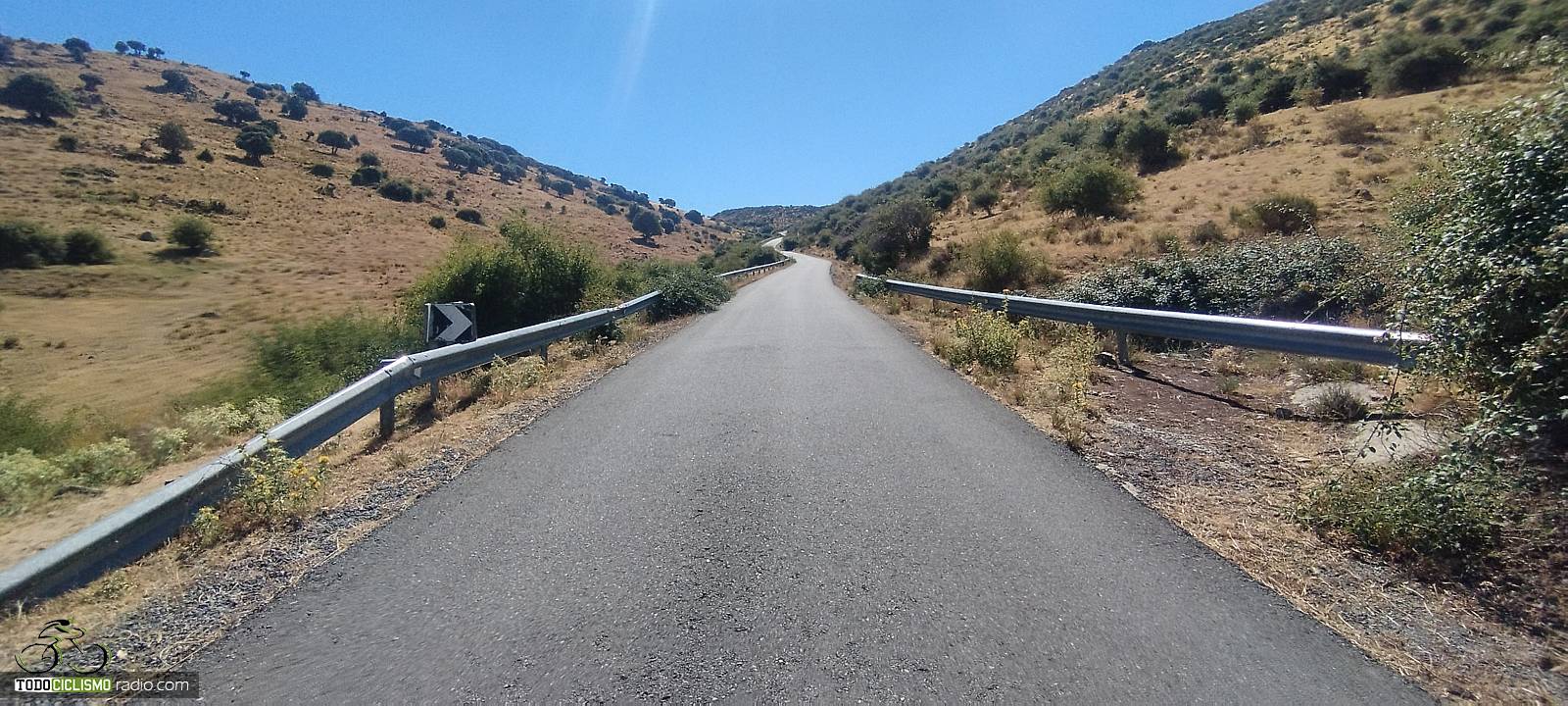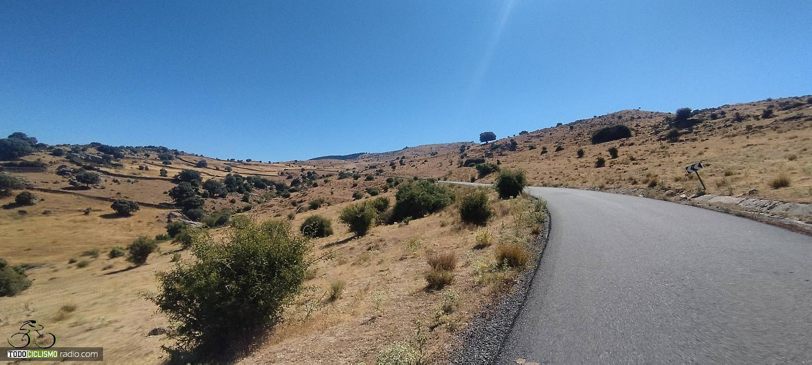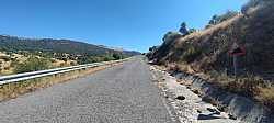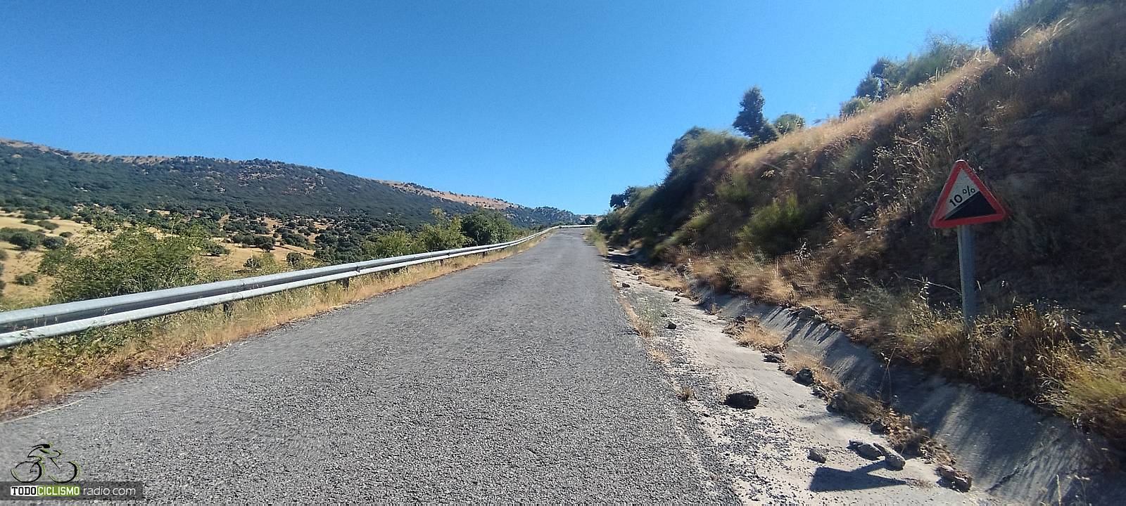 La carretera se adentra desde el puente hacia una zona muy abierta y expuesta, donde es habitual que el sol y el viento jueguen un papel importante. Aun así, en jornadas de buena temperatura la subida se disfruta más, ya que no hay arbolado que proporcione sombra. Nada más salir de El Herradón encontramos ya las primeras señales que advierten rampas al 10 %, un buen anticipo de lo que nos espera más arriba: tramos duros encadenados con otros solo ligeramente más benévolos.