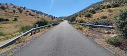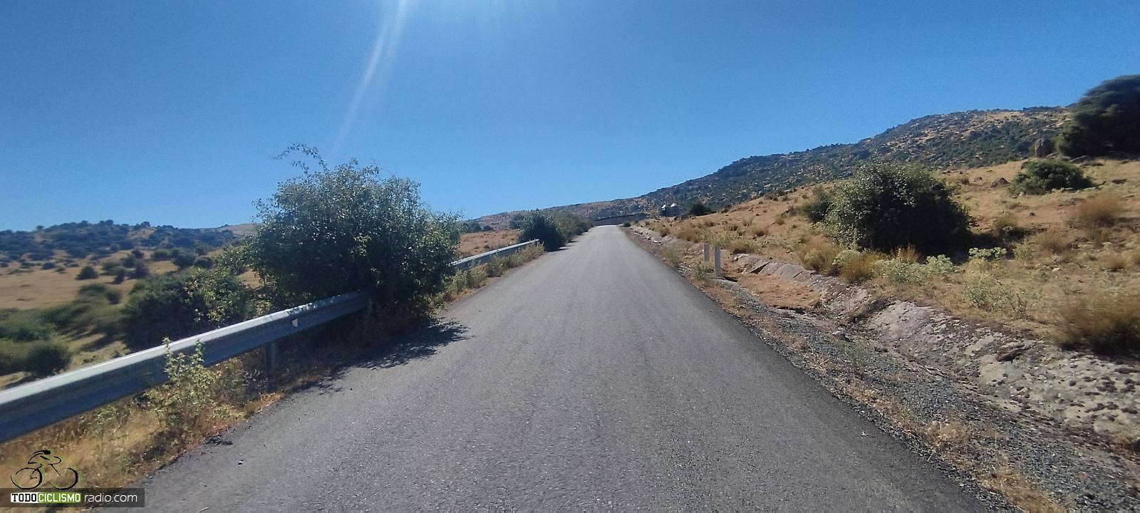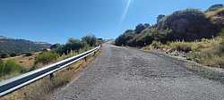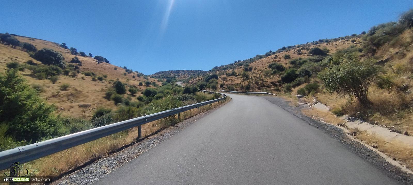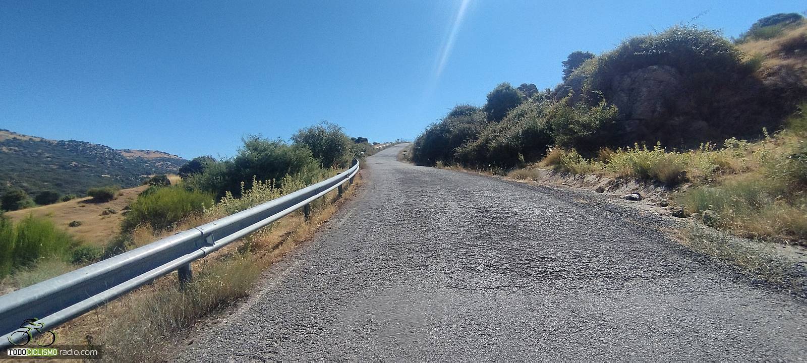 La carretera se adentra desde el puente hacia una zona muy abierta y expuesta, donde es habitual que el sol y el viento jueguen un papel importante. Aun así, en jornadas de buena temperatura la subida se disfruta más, ya que no hay arbolado que proporcione sombra. Nada más salir de El Herradón encontramos ya las primeras señales que advierten rampas al 10 %, un buen anticipo de lo que nos espera más arriba: tramos duros encadenados con otros solo ligeramente más benévolos.