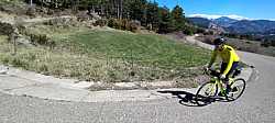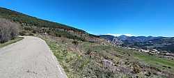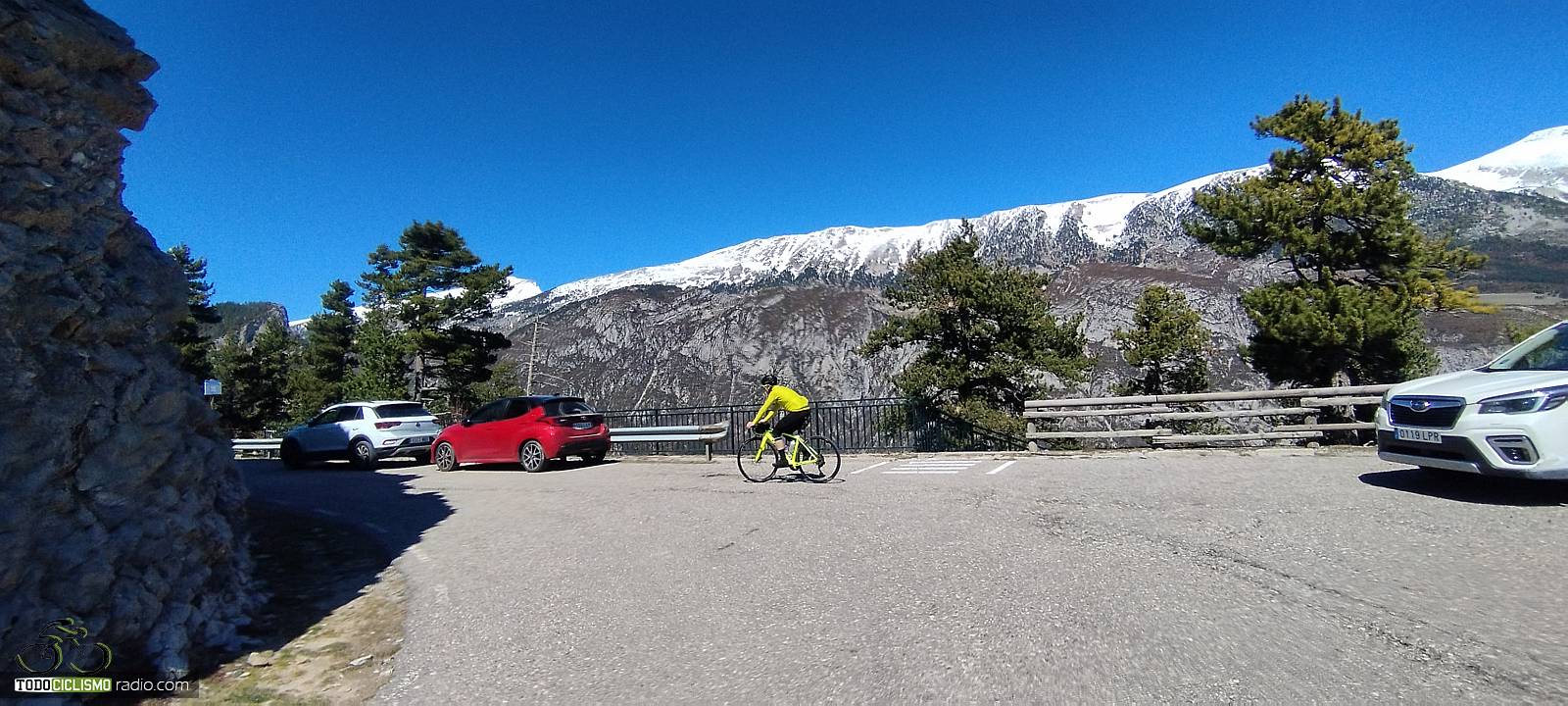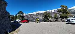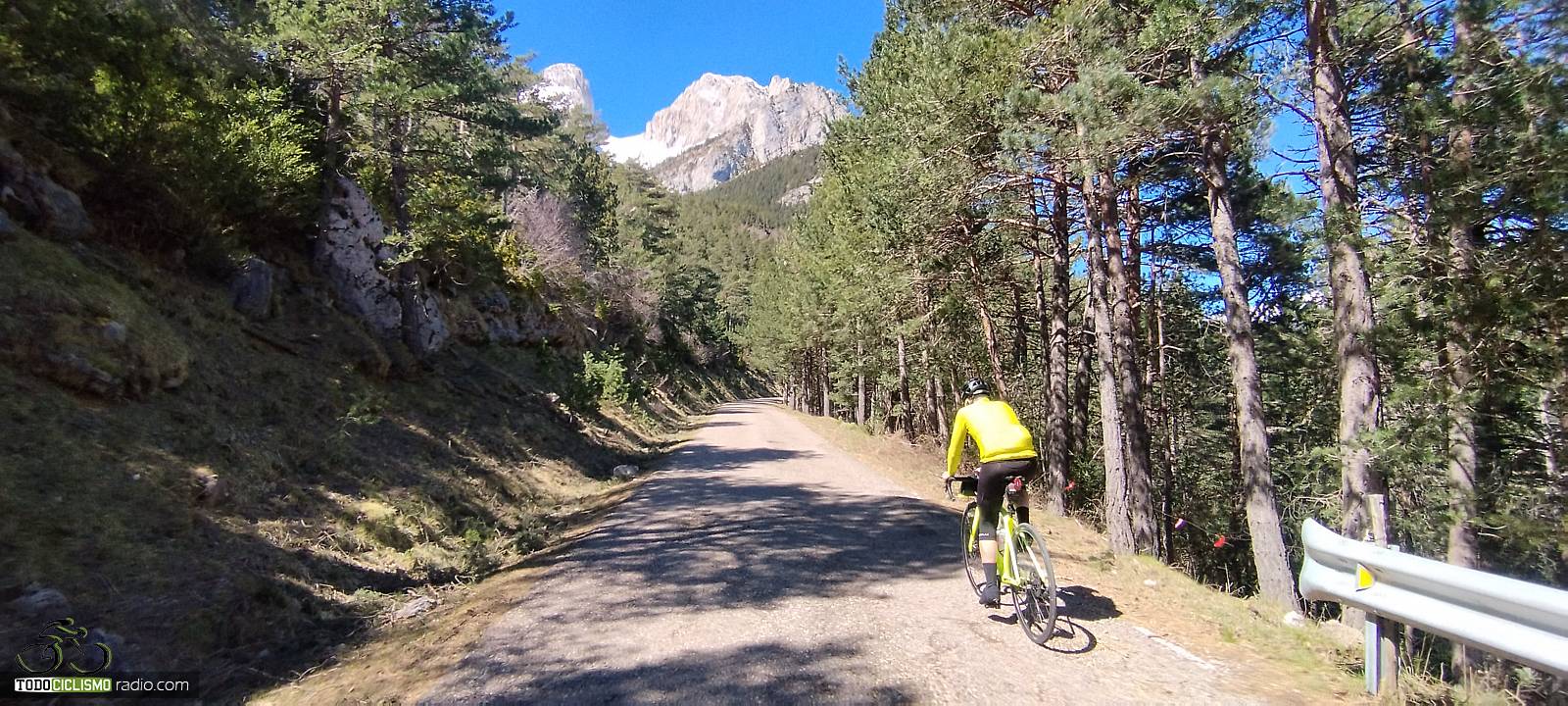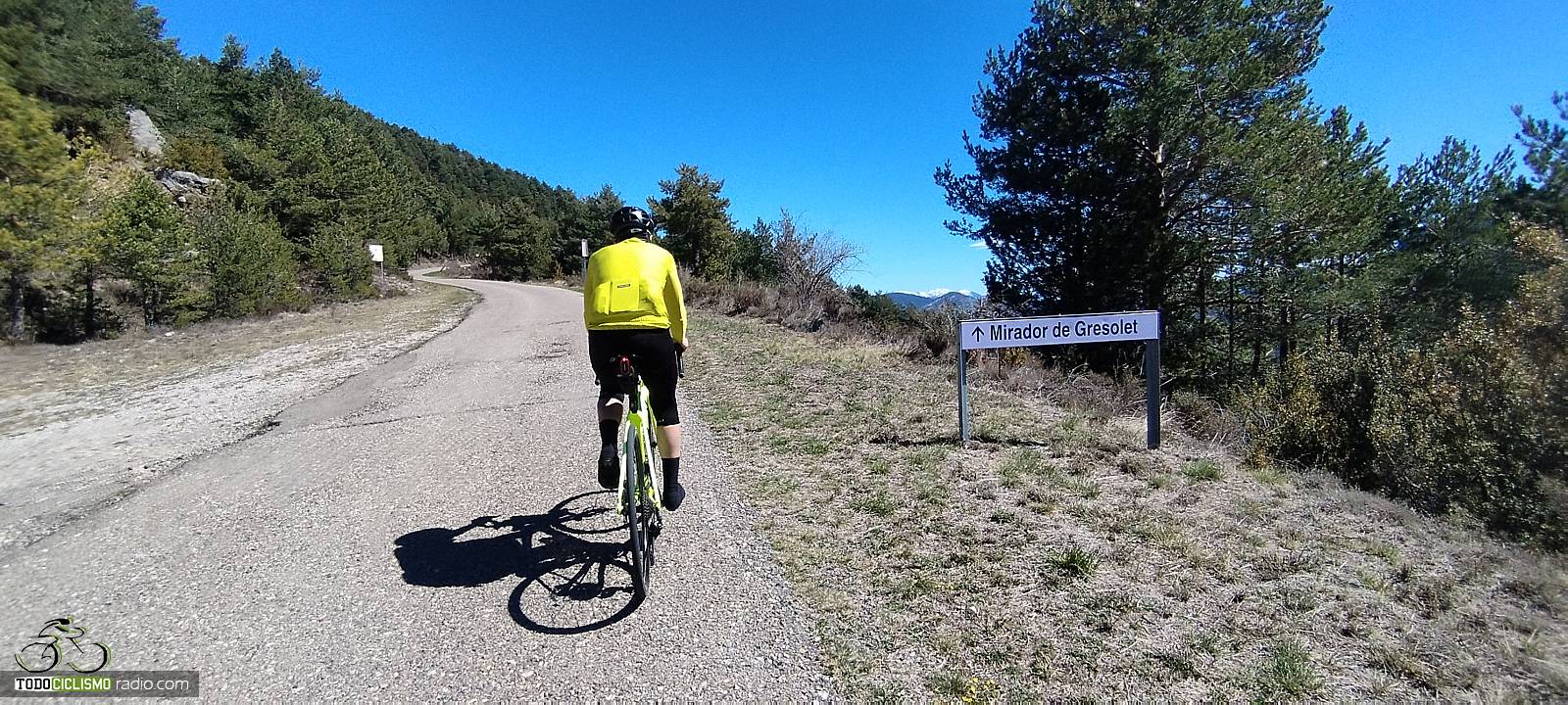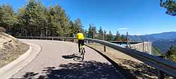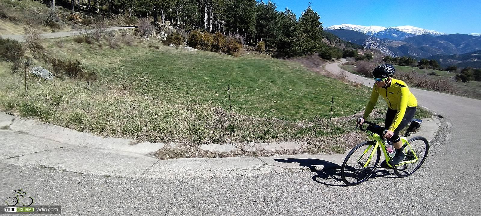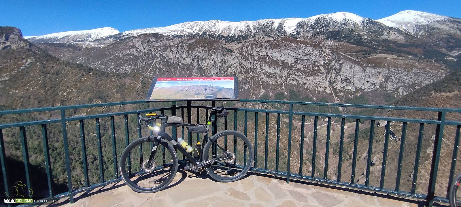 Entre pinos y rampas, voy buscando el Mirador del GressoletParo a respirar en el Mirador del Gresolet, con la bici frente a las montañas nevadas