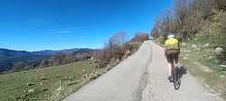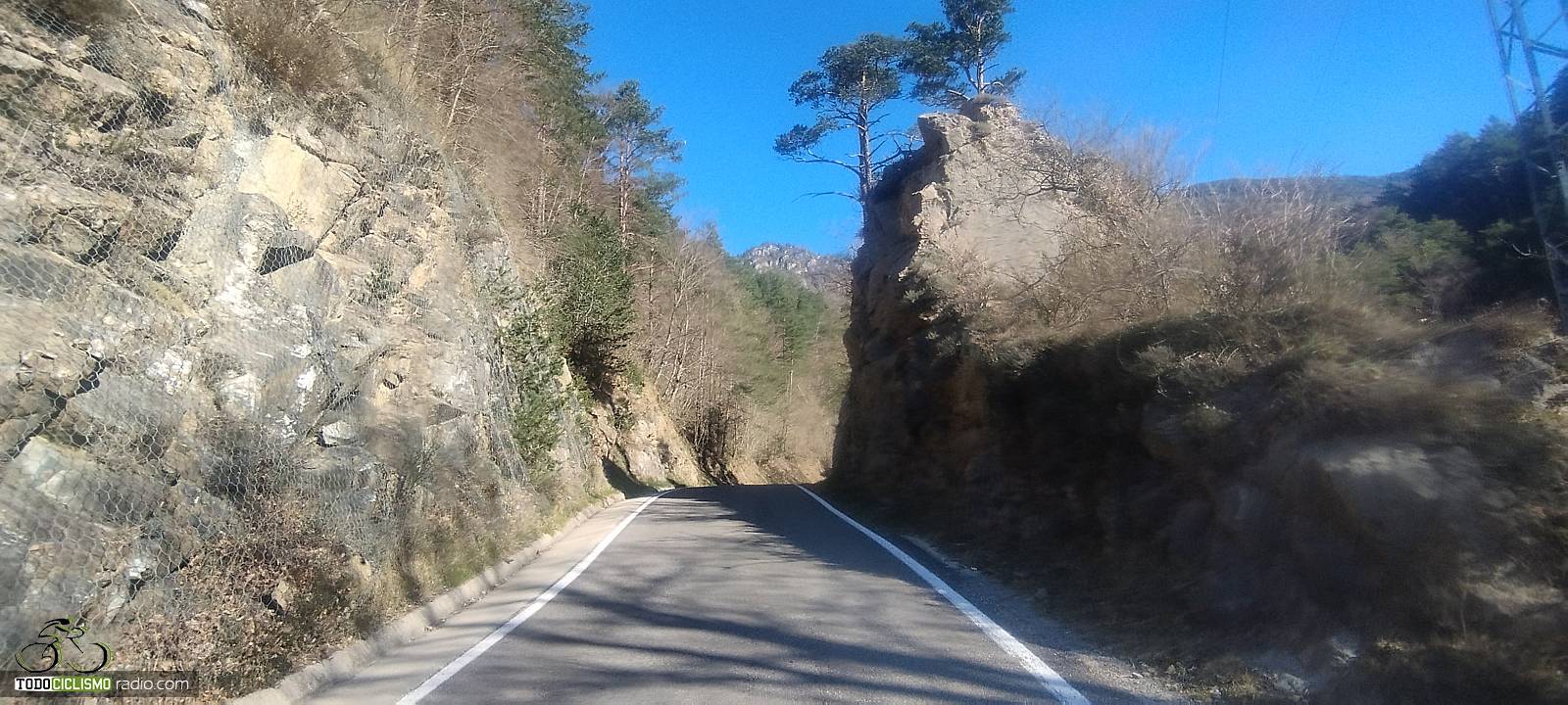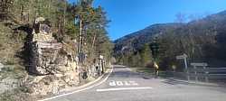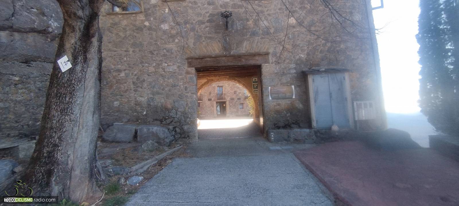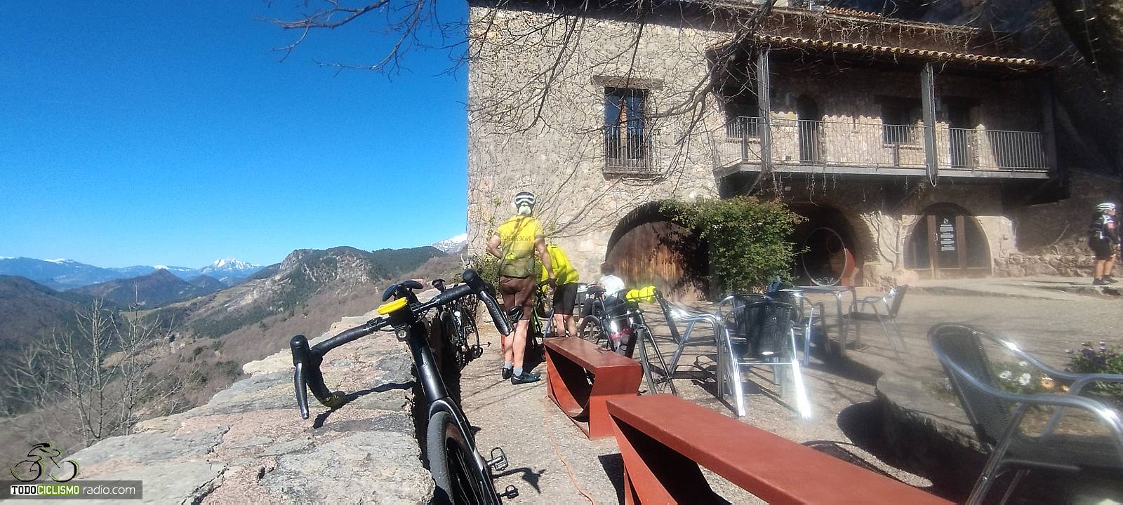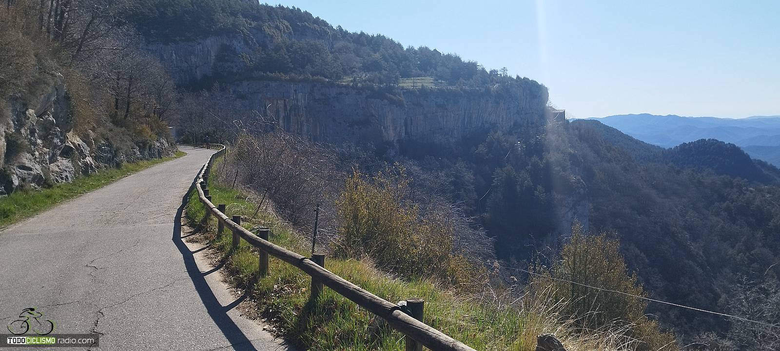 Entre pared de roca y bosque, voy pillando ritmo camino del Santuario de MontgronyLa roca se cierra sobre la carretera y nos mete de lleno en MontgronyLa carretera se asoma al vacío camino del Santuario de MontgronyDespués de los rampones, cruzar este arco del Santuario de Montgrony sabe a gloriaCoronando Montgrony, terraza al sol y bici apoyada antes de bajar a Gombrén