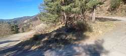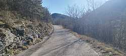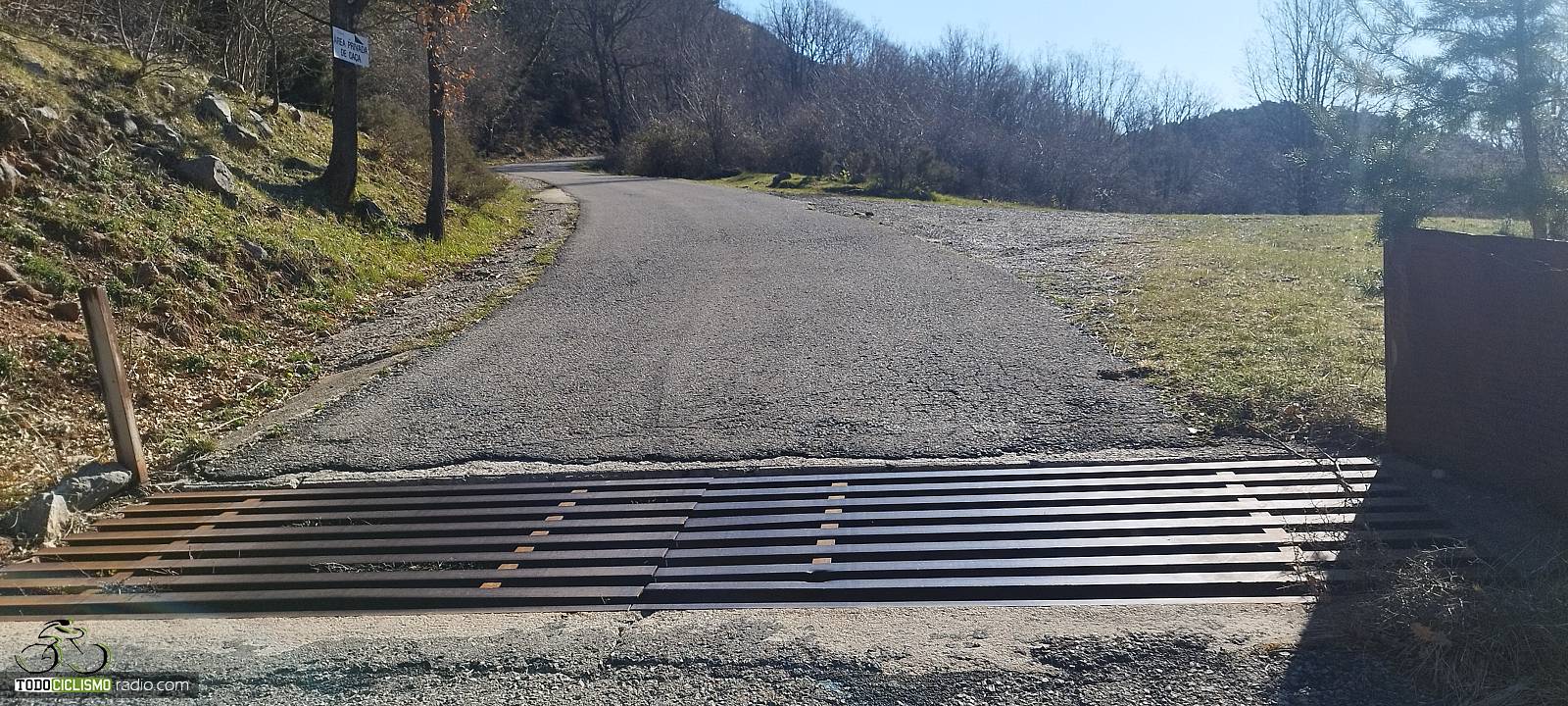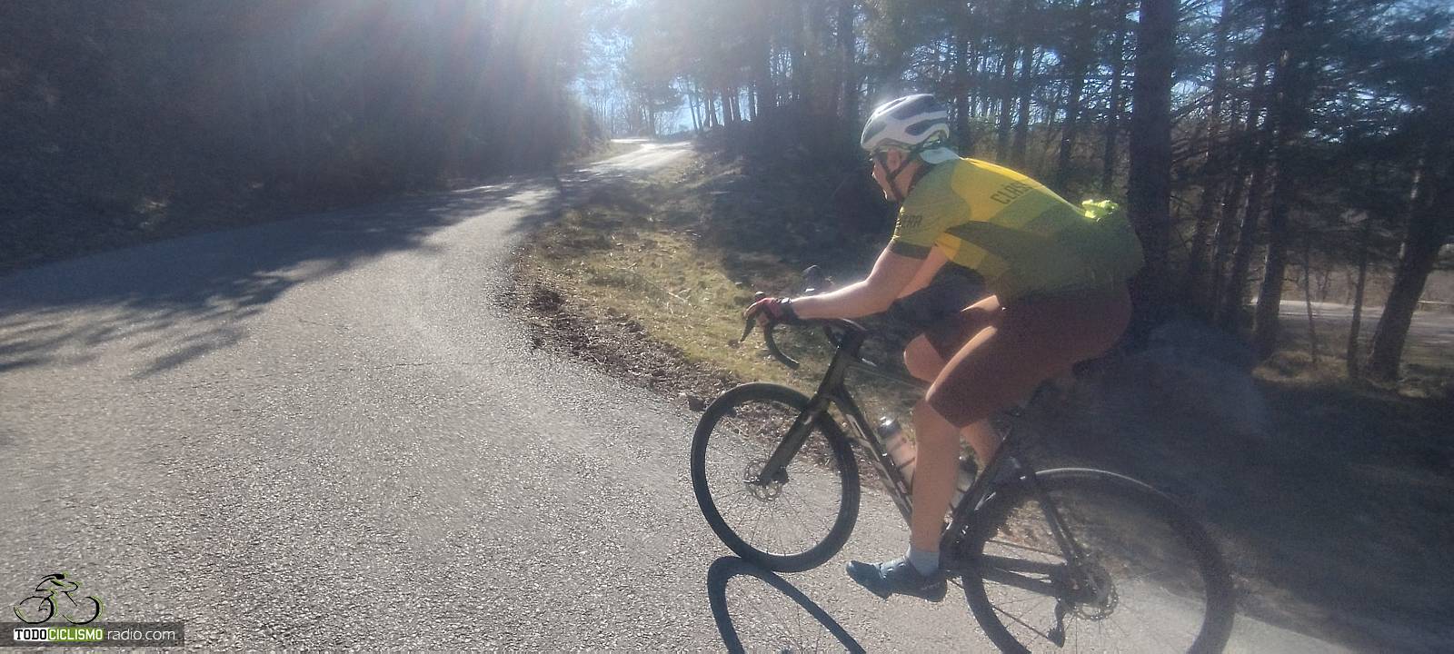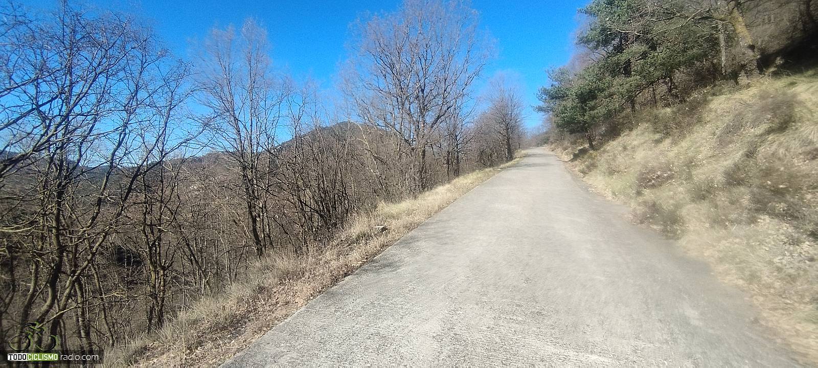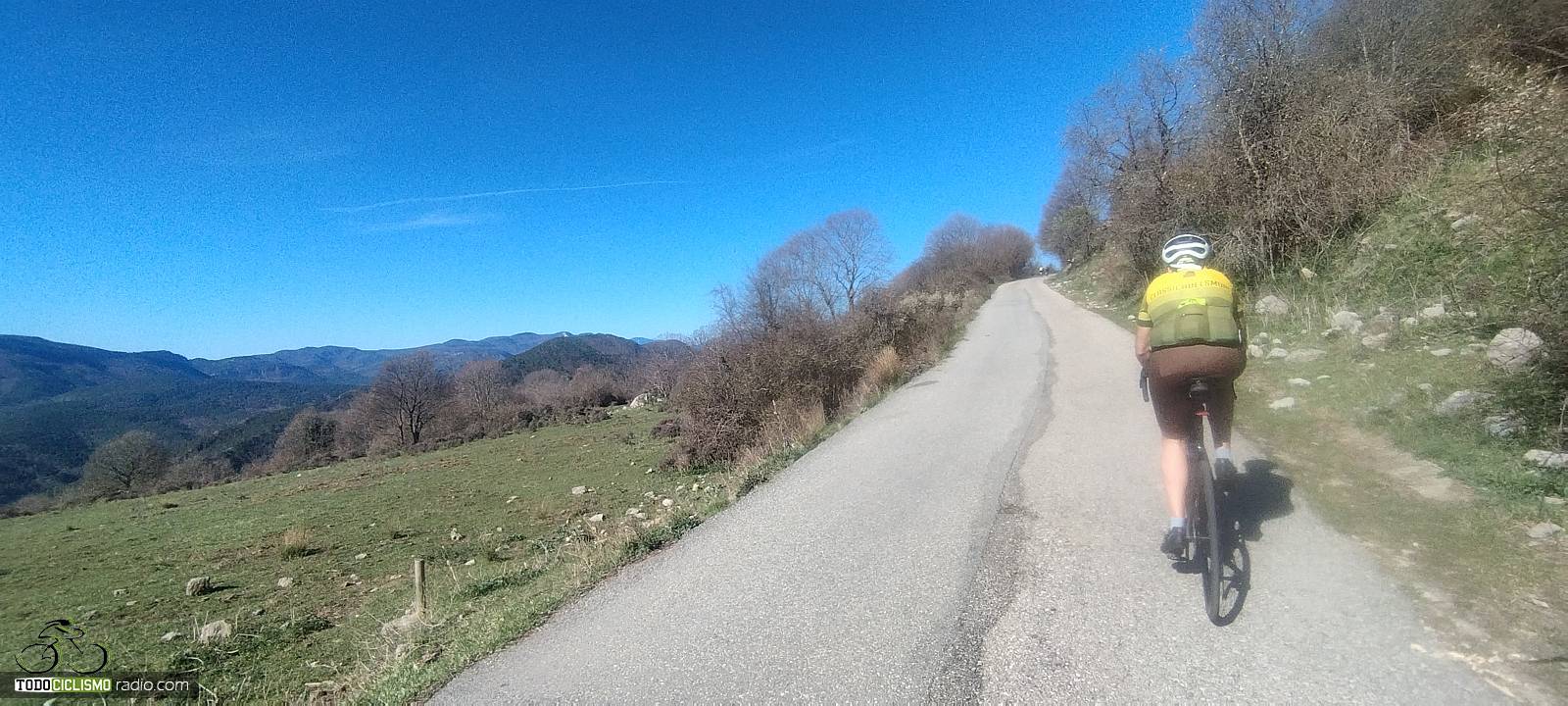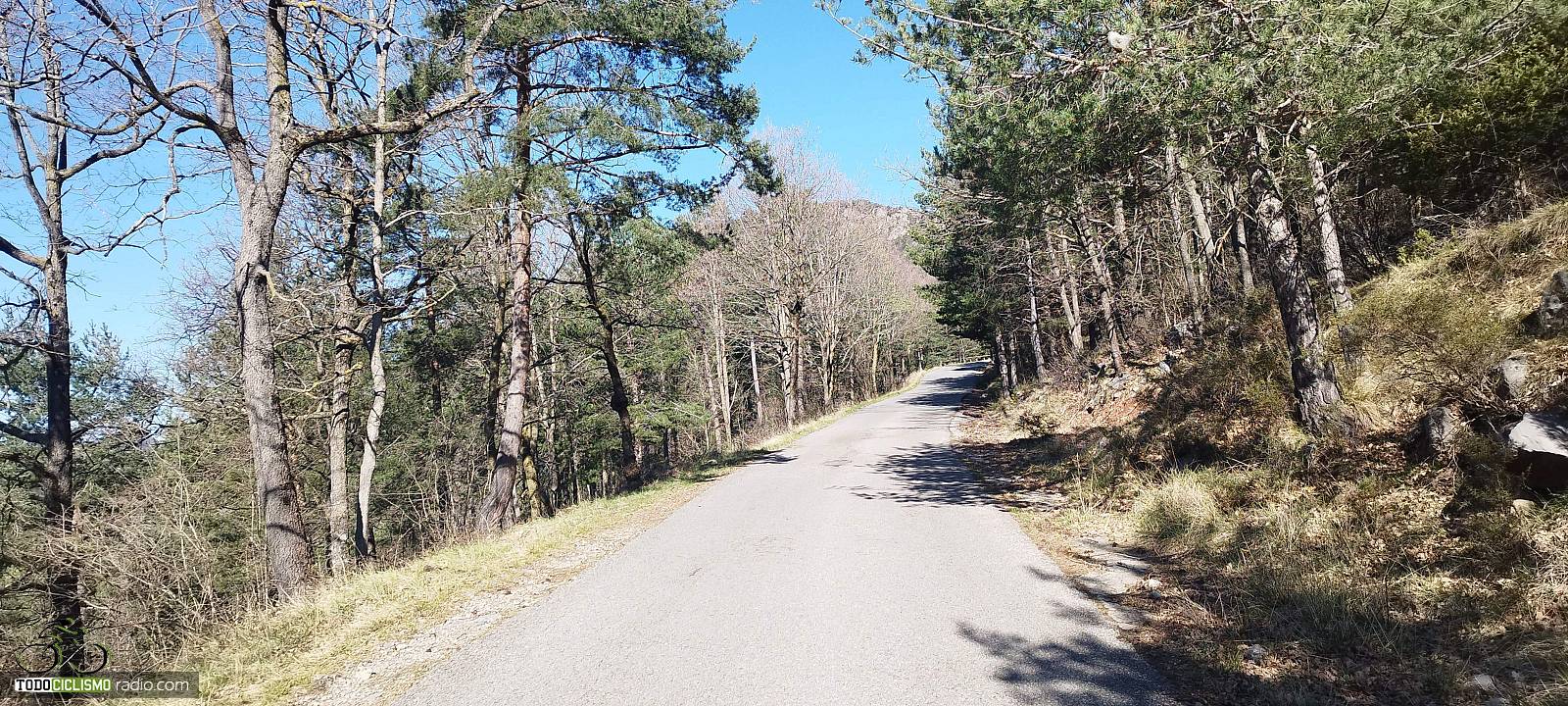 Entre pared de roca y bosque, voy pillando ritmo camino del Santuario de MontgronyLa roca se cierra sobre la carretera y nos mete de lleno en MontgronyLa carretera se asoma al vacío camino del Santuario de MontgronyDespués de los rampones, cruzar este arco del Santuario de Montgrony sabe a gloriaCoronando Montgrony, terraza al sol y bici apoyada antes de bajar a Gombrén