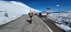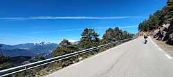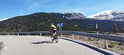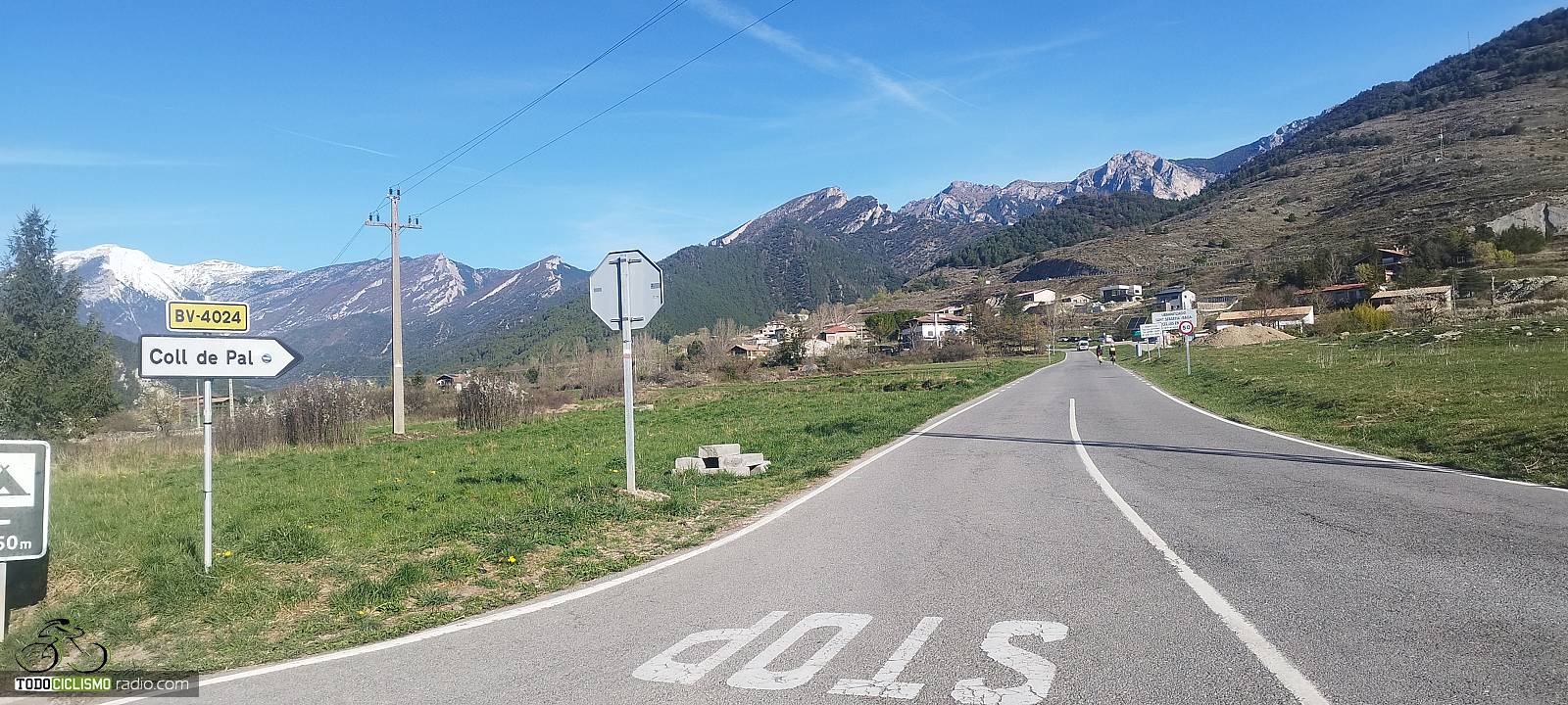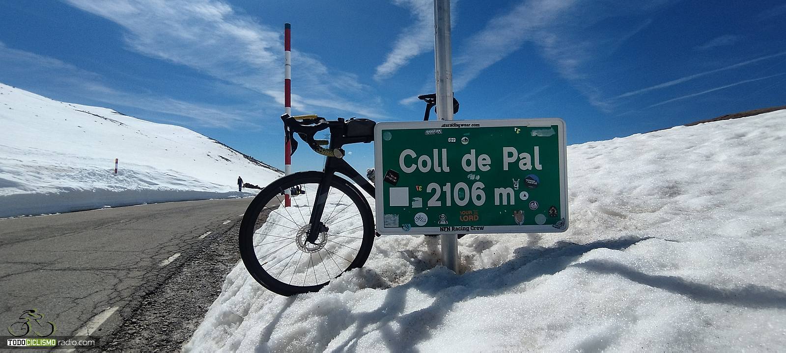 La carretera se retuerce hacia el viaducto subiendo el Coll de Pal desde BagàEntre sombras y sol, voy ganando metros camino del Coll de PalEntre neveros y rampas finales, el Coll de Pal nos aprieta las piernasLa bici apoyada en el cartel, 2106 m en el Coll de Pal bien ganados entre nieve